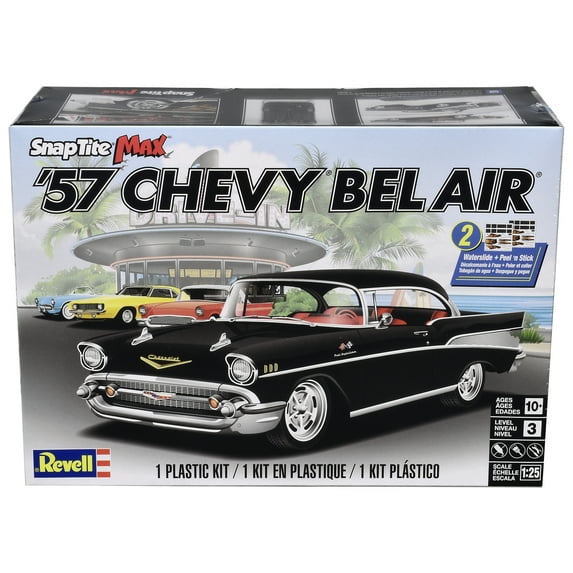 Brand new plastic model kit of 1957 Chevrolet Bel Air (Level 3 Snap Tite Max) 1/25 plastic model kit by Revell. Brand new box. Soft black tires. Solid metal axles. Colorful decal artwork. Vintage style packaging. Officially licensed product. Chrome plated small parts. Contains 30 detailed parts. Paint and cement NOT required. Manufacturer's original unopened packaging. Dimensions approximately L-8 inches assembled. Parts molded in COLOR, unless otherwise indicated. "Chrome" trim detail can be striped on with silver paint.