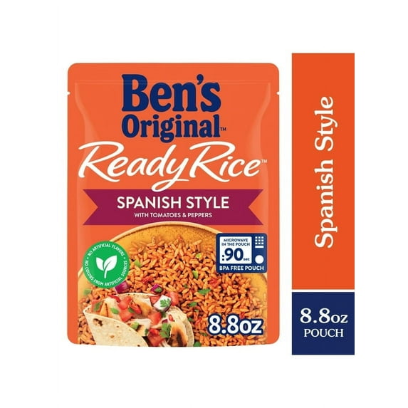 BEN'S ORIGINAL Ready Rice Spanish Style Flavored Rice is a convenient microwave rice option that makes it easy to taste deliciously seasoned, Spanish-inspired parboiled rice in seconds. This Spanish rice pouch offers pre-cooked long grain rice with the savory flavors of tomatoes, peppers, herbs, and spices for a cooked rice side dish you and your guests will love. Available in an easy-to-handle, BPA-free microwaveable rice pouch, Ready Rice eliminates prep and cleanup to help you spend less time in the kitchen. Bring a flavorful addition to your meals by cooking this Spanish rice in the microwave for 90 seconds, or thoroughly heating it in a skillet before serving. Pair this seasoned rice with chicken, Mexican dishes, or serve it plain for a quick bite. This parboiled rice contains no artificial flavors, no colors from artificial sources, no trans fat, or cholesterol. BEN'S ORIGINAL is dedicated to creating meals and experiences that offer everyone a seat at the table. One 8.8 oz pouch of BEN'S ORIGINAL Ready Rice Spanish Style Flavored Rice Deliciously seasoned, Spanish-inspired parboiled rice that is ready to eat in seconds This microwave rice pouch offers long grain rice with tomatoes, peppers, herbs, and spices for a cooked rice side dish you and your guests will love Pair this seasoned rice with chicken, Mexican dishes, or serve it plain for a quick bite Cook this Spanish rice in the microwave for 90 seconds, or thoroughly heat it in a skillet before serving