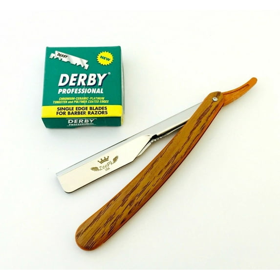 Professional Quality Straight Razor with Wooden Print on it, handle is plastic not wood.100 Derby Single Edge BladesGreat for Salon, Barber ShopsPlease take extra caution as the blades are extremely sharp