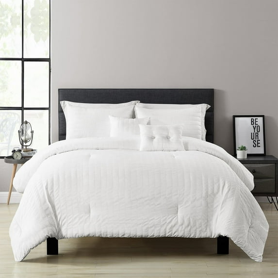 Refresh your master bedroom or guest bedroom with this Farmhouse Seersucker 5 Piece Comforter Set. The soft comforter will keep you warm and cozy year round. The minimalist solid color textured look brightens the space without overwhelming the room.