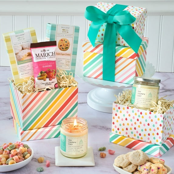 Say “Happy Birthday” with this festive birthday-themed gift tower. Bright and cheery boxes are filled with our favorite birthday celebration treats. To please their sweet tooth, we’ve artfully arranged gourmet popcorn and fruity candy inside the box tiers. This gift is sure to make their birthday a memorable one!