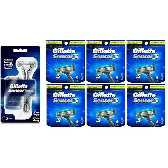 Gillette Sensor Excel Razor w/ 3 Cartridges + Gillette Sensor3 8 Ct. Refill Blades (Pack of 6)