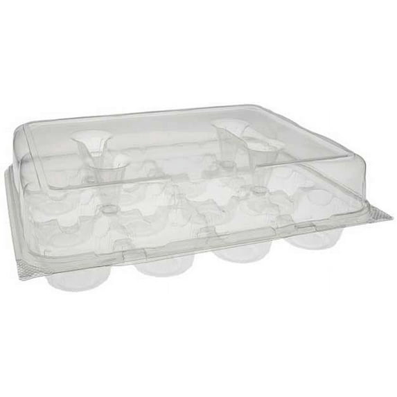 The Pactiv Clear Cupcake Clamshell Container can be used to store or carry cupcakes. Made from recycled PET plastic, this clamshell container is resistant to leaks. It can hold up to 12 cupcakes. Ideal for cafes, bakeries, and cake shops, this bulk case contains 115 Pactiv clamshell containers.