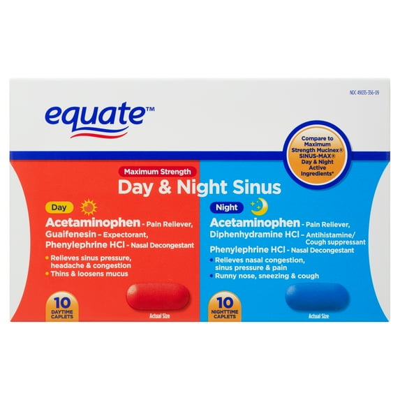Equate Maximum Strength Day and Night Sinus Caplets temporarily relieve nasal congestion, headache, minor aches and pains, sinus congestion and pressure. The daytime caplets also help loosen phlegm (mucus) and thin bronchial secretions to rid the bronchial passageways of bothersome mucus and make coughs more productive. The nighttime caplets also work to temporarily relieve cough and runny nose or sneezing. Both types of caplets contain acetaminophen which acts as a pain reliever. Get the relief you need with Equate Maximum Strength Day and Night Sinus Caplets.