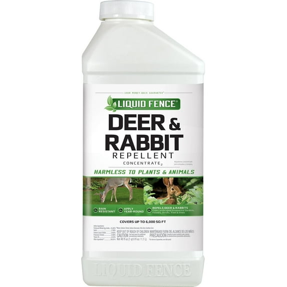 - Liquid Fence Deer & Rabbit Repellent Concentrate 40oz For repelling deer and rabbits from landscaped garden areas, flowers, shrub plants, trees, and vines