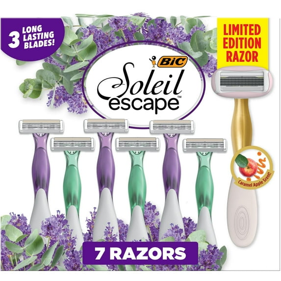 Hero image 0 of BIC Soleil Escape Women's Disposable Razor 3 Blade Set, Moisture Strip With Almond Oil, Lavender and Eucalyptus Scented Handles, Includes Bonus Caramel Apple, 8 Razors, 0 of 7