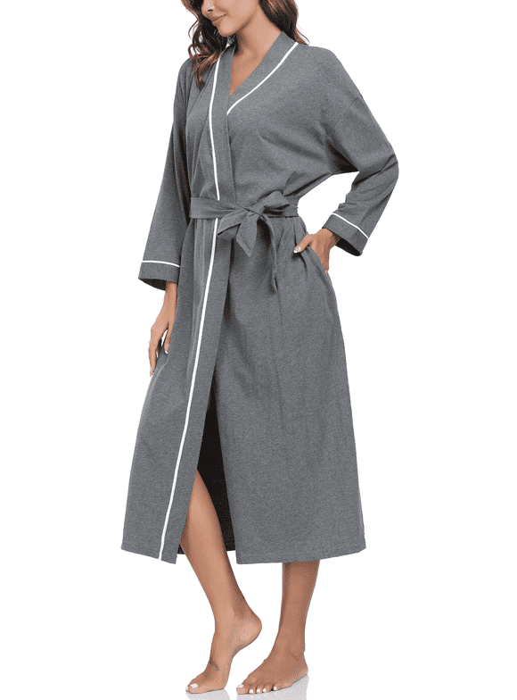 100% Cotton Womens Long Robe Lightweight Kimono Bath Robe with Pockets(Deep Gray,L)